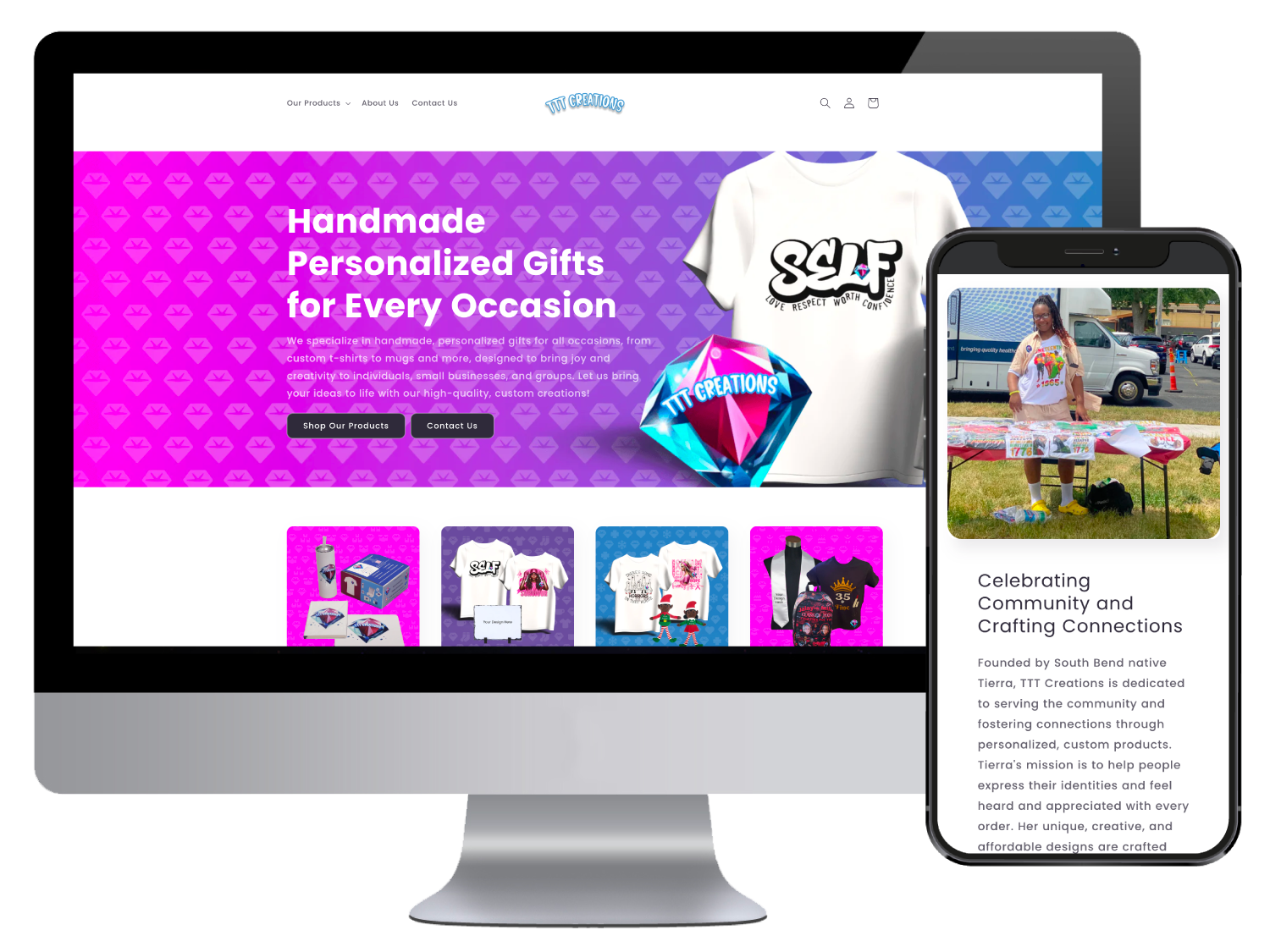 A refreshed Shopify store that aligns with TTT Creations’ brand and presents products in a more organized, intuitive way. Working in tandem with Notre Dame students, we helped strengthen the client’s online brand image and position the business for growth. The updated store supports both individual purchases and future bulk orders, creating a scalable foundation for the next phase of the business.